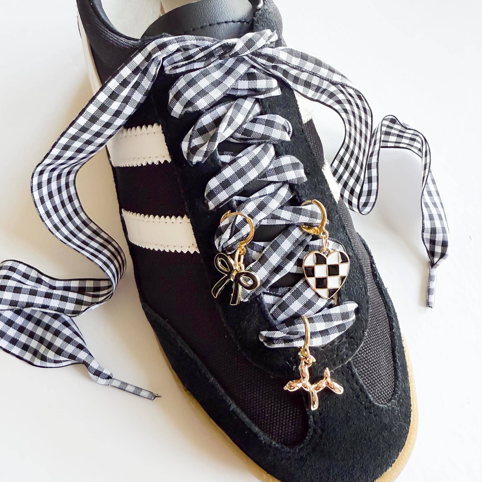 Give your sneakers a stylish upgrade with our Gingham Bow & Gold Charm Sneaker Lace Set! This set includes a trendy black-and-white gingham set of laces that ties effortlessly around your sneakers, along with three chic gold-accented charms—Designed for sneaker lovers who want to stand out, this set is the perfect blend of trendy and timeless.